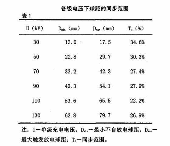為了對各級沖擊電壓下球距的同步特性進(jìn)行研究,試驗中采用逐級升高電壓,尋找各級放電電壓下對應(yīng)的最大觸發(fā)放電球隙max和最小不自放電球隙Dmin, 每點(diǎn)均進(jìn)行放電范圍試驗, 并按式計算其同步范圍, 各級電壓下對應(yīng)的Dmax和Dmin及同步范圍見表1。