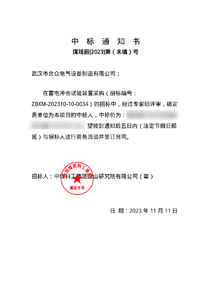 在雷電沖擊試驗裝置采購( 招標編號:ZBXM-202310-10-0034 ) 的招標中,經過專家組評審,確定貴單位為本項目的中標人。望接到通知后五日內(法定節假日順延)與招標人進行商務洽談并簽訂合同。