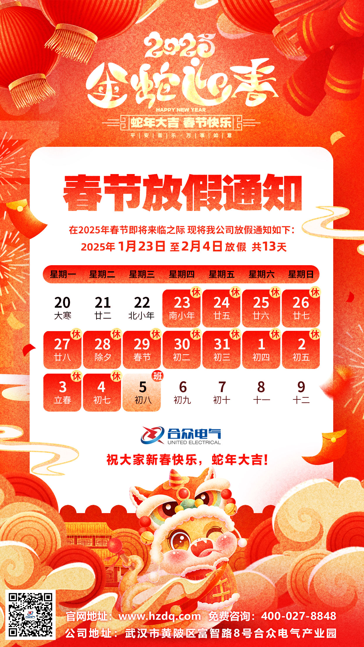 武漢市合眾電氣2025年春節放假通知