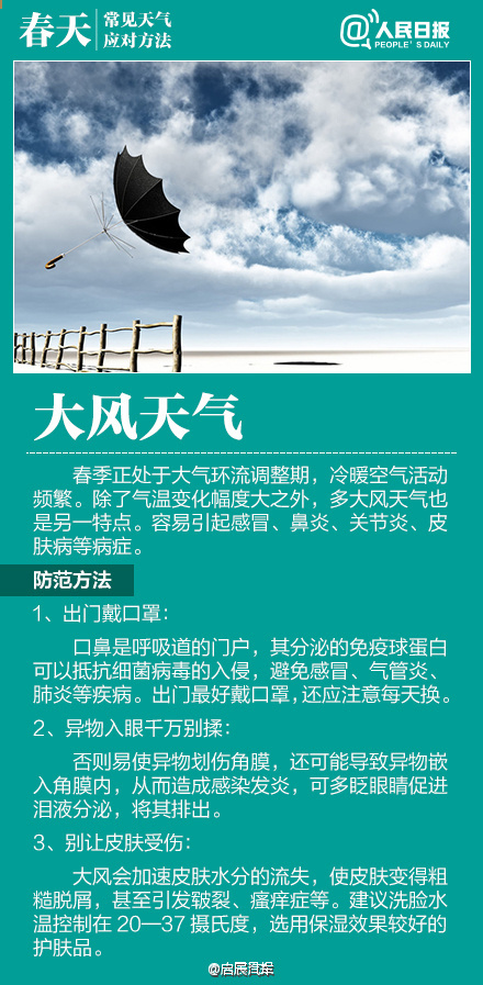 如何應對初春多變天氣作者:合眾電氣發布時間:2016-03-23瀏覽量:11039 次字體顯示:【大】【中】【小】 春季天氣調皮,昨天還日光融融閑賞花,今日就寒風瑟瑟緊添衣!大風、沙塵、陰雨等交替上演,讓感冒、過敏、關節炎等進入高發期。今天#世界氣象日#,四張圖教你應對春季多變天氣! 上一篇: HZXC-104D變壓器智能控制箱最新發貨現場下一篇: 面對問題疫苗,我們怎么辦?