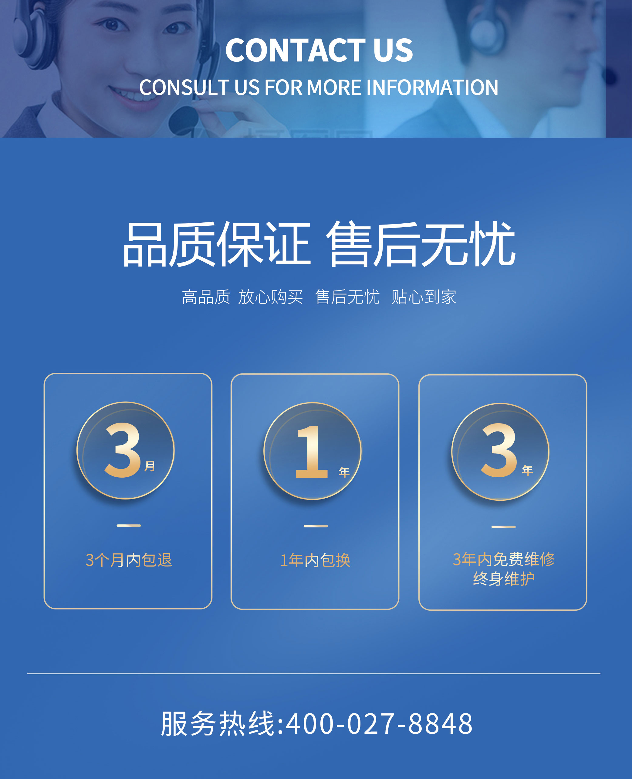 我們的售后服務(wù)承諾是:“3個月內(nèi)包退,1年內(nèi)包換、3年免費維修,終身維護”。在未來的日子里,我們將一如既往的堅持三類星級服務(wù)!