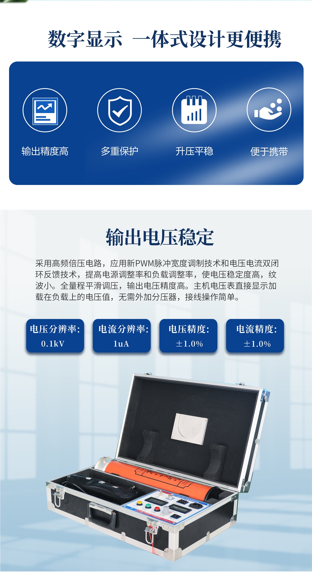 采用了高頻倍壓電路,應(yīng)用了新的PWM高頻脈寬調(diào)制技術(shù),閉環(huán)調(diào)整,采用了電壓大反饋,使電壓穩(wěn)定度大幅度提高。使用性能卓越的大功率IGBT器件及驅(qū)動技術(shù),并根據(jù)電磁兼容性理論,采用特殊屏蔽、隔離和接地等措施。使直流高壓發(fā)生器實現(xiàn)了高品質(zhì)、便攜式,并能承受額定電壓放電而不損壞。具有輸出功率大、體積小的特點,有可靠的過壓、過流及零位合閘保護功能,帶0.75倍電壓切換功能。