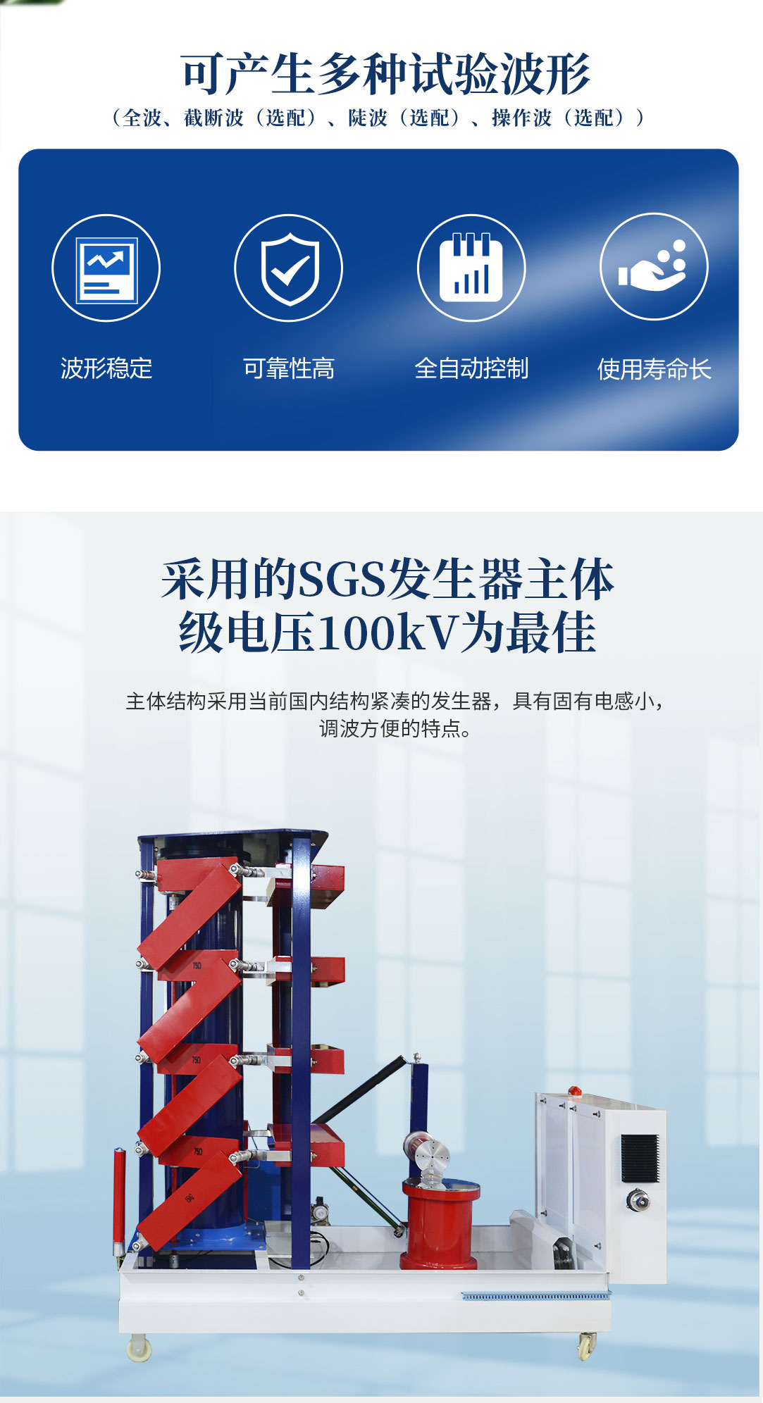1、采用的SGS發(fā)生器主體,級電壓為100kV,符合當(dāng)前國內(nèi)外的發(fā)展趨勢。主體結(jié)構(gòu)采用當(dāng)前國內(nèi)結(jié)構(gòu)緊湊的發(fā)生器,具有固有電感小,調(diào)波方便的特點(diǎn)。