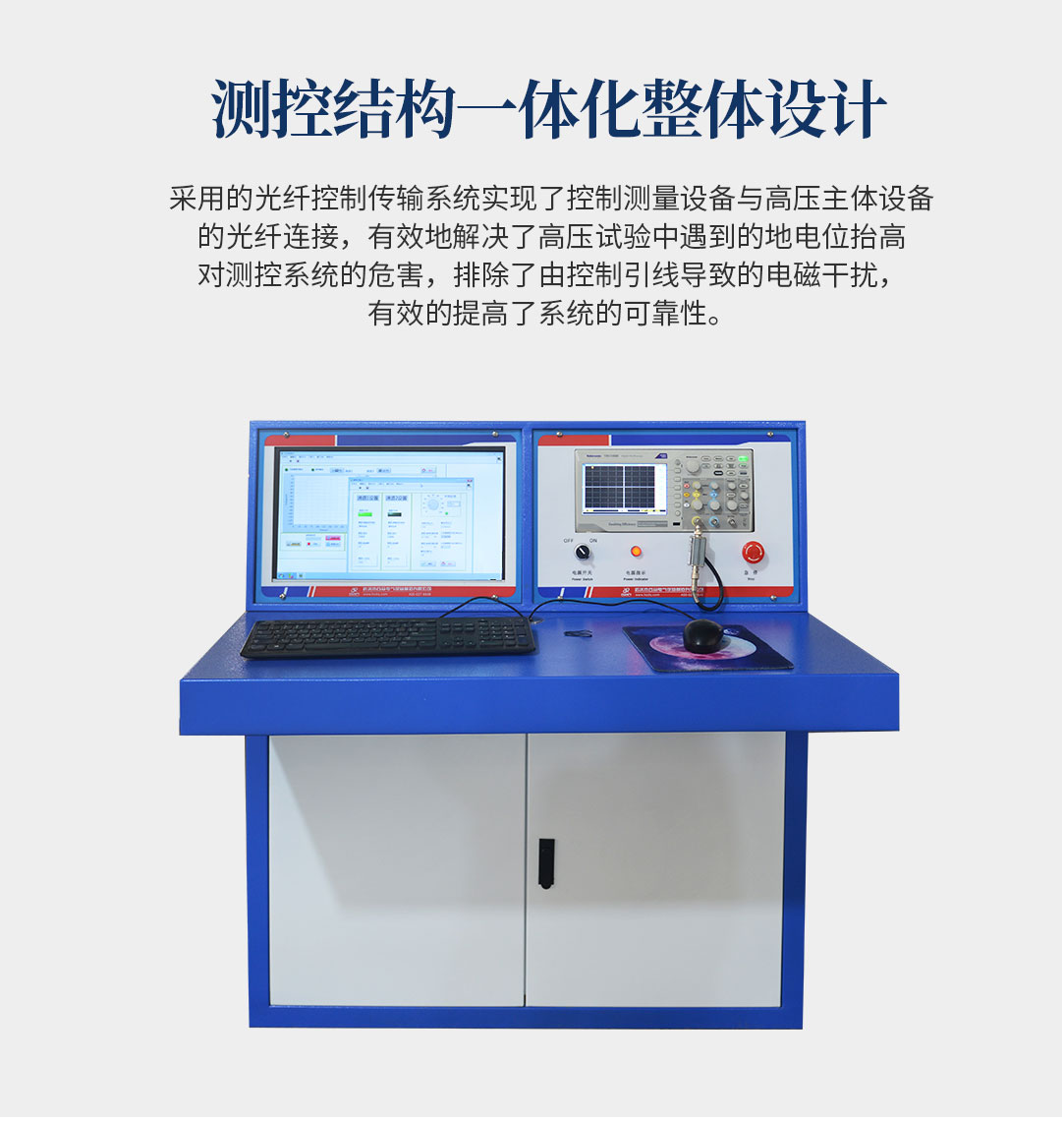 4、采用的光纖控制傳輸系統(tǒng)在國內(nèi)高壓試驗設(shè)備中是創(chuàng)新,它實(shí)現(xiàn)了控制測量設(shè)備與高壓主體設(shè)備的光纖連接,有效地解決了高壓試驗中遇到的地電位抬高對測控系統(tǒng)的危害,排除了由控制引線導(dǎo)致的電磁干擾,極大地提高了系統(tǒng)的可靠性。