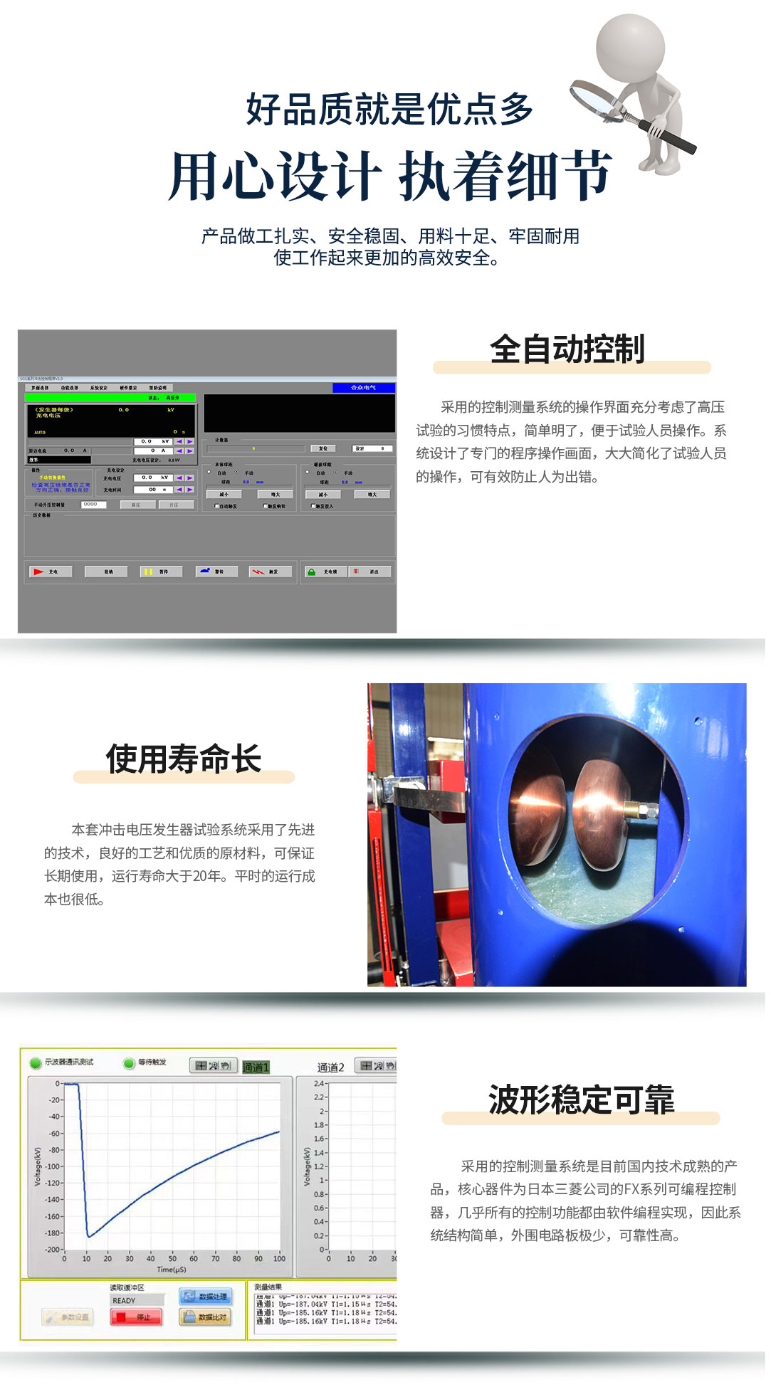 6、本套沖擊電壓發(fā)生器試驗系統(tǒng)采用了先進(jìn)的技術(shù),良好的工藝和優(yōu)質(zhì)的原材料,可保證長期使用,運(yùn)行壽命大于20年。平時的運(yùn)行成本也很低。