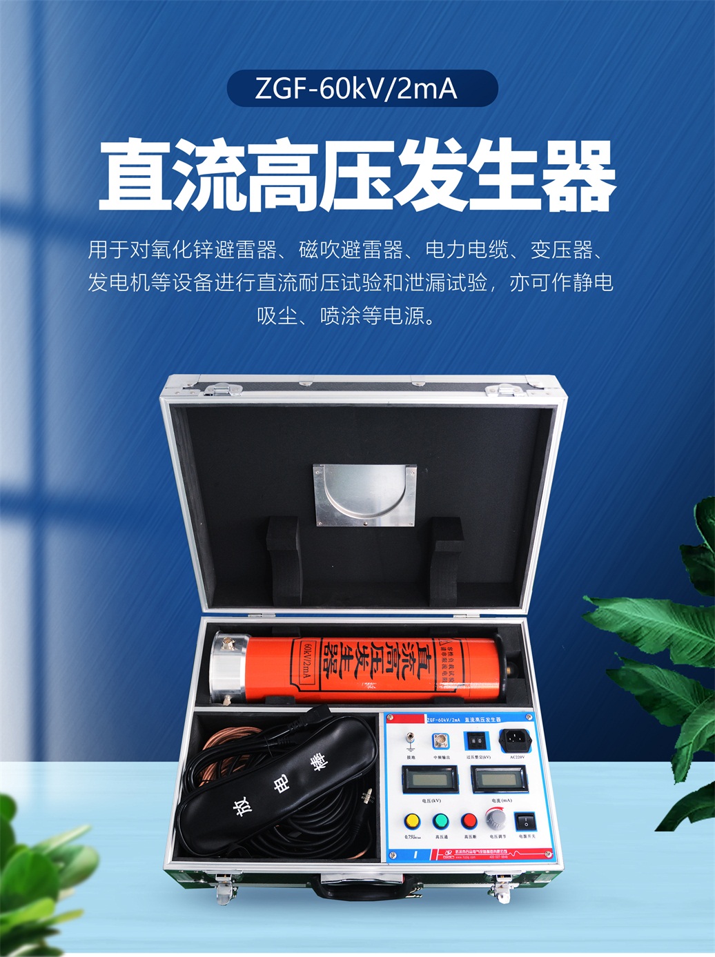 本儀器適用于電力、鐵路、化工、工礦、冶金、鋼鐵等部門對(duì)氧化鋅避雷器、磁吹避雷器、電力電纜、變壓器、發(fā)電機(jī)等設(shè)備進(jìn)行直流耐壓試驗(yàn)和泄漏試驗(yàn),亦可作靜電吸塵、噴涂等電源。