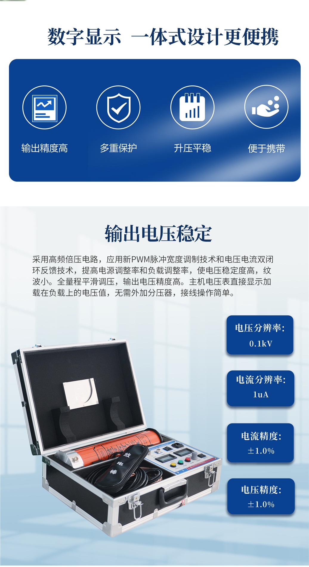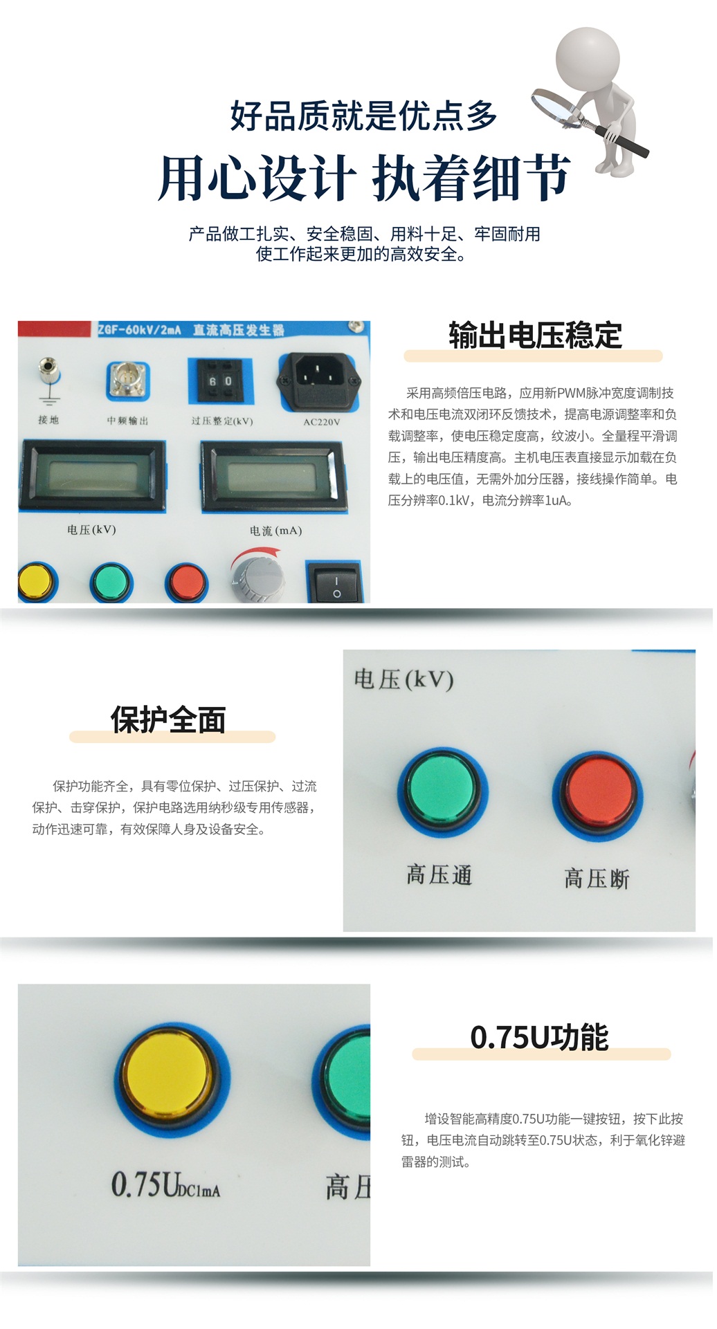 本儀器采用高頻倍壓電路,應(yīng)用新PWM脈沖寬度調(diào)制技術(shù)和電壓電流雙閉環(huán)反饋技術(shù),提高電源調(diào)整率和負(fù)載調(diào)整率,使電壓穩(wěn)定度高,紋波小。使用進(jìn)口大功率IGBT器件及其驅(qū)動(dòng)技術(shù),消除開(kāi)關(guān)干擾,實(shí)現(xiàn)直流高壓發(fā)生器的高品質(zhì)和便攜性。選用進(jìn)口高頻高壓整流二極管,使倍壓筒更加小巧輕便,提升整機(jī)效率。根據(jù)EMI電磁干擾和EMC電磁兼容理論,采用屏蔽、隔離和接地等措施,提升整機(jī)安全性,并能承受額定電壓放電而不損壞。儀器保護(hù)功能齊全,具有零位保護(hù)、過(guò)壓保護(hù)、過(guò)流保護(hù)、擊穿保護(hù),保護(hù)電路選用納秒級(jí)專用傳感器,動(dòng)作迅速可靠,有效保障人身及設(shè)備安全。過(guò)壓整定選用數(shù)字撥碼開(kāi)關(guān),操作簡(jiǎn)單并具有較高的整定精度。增設(shè)智能高精度0.75U功能按鈕,利于氧化鋅避雷器的測(cè)試。