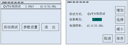 首先根據(jù)相應(yīng)的接線提示接好儀器外部的連線,然后點(diǎn)擊主界面“CVT測(cè)試”選項(xiàng),進(jìn)入下一級(jí)CVT測(cè)試菜單(如圖5-5)。然后可以點(diǎn)擊“參數(shù)設(shè)置”進(jìn)去設(shè)置菜單(如圖5-5)進(jìn)行詳細(xì)的測(cè)試參數(shù)設(shè)置。分別點(diǎn)擊每個(gè)需要設(shè)置的項(xiàng)目,按“增加”“減小”或“選擇”來(lái)修改。修改完成后點(diǎn)擊“保存”即可保存剛才所修改的參數(shù)并返回CVT測(cè)試界面,點(diǎn)擊“取消”則不保存本次修改并返回CVT測(cè)試界面。