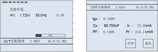 相關(guān)參數(shù)設(shè)置好了后長(zhǎng)按“啟動(dòng)測(cè)試”單,進(jìn)入測(cè)試菜單(如圖5-7)。測(cè)試過(guò)程中電壓值一項(xiàng)是根據(jù)先前所選擇的測(cè)試電壓平滑至設(shè)置值后保持不變,然后自動(dòng)開(kāi)始測(cè)試。開(kāi)始測(cè)試后根據(jù)先前所選擇的干擾頻率自動(dòng)變頻到相應(yīng)的頻率進(jìn)行測(cè)試,測(cè)試完成后自動(dòng)顯示測(cè)試結(jié)果(如圖5-7)。測(cè)試結(jié)果自動(dòng)保存,可點(diǎn)擊“打印”按鈕打印本次測(cè)試結(jié)果。