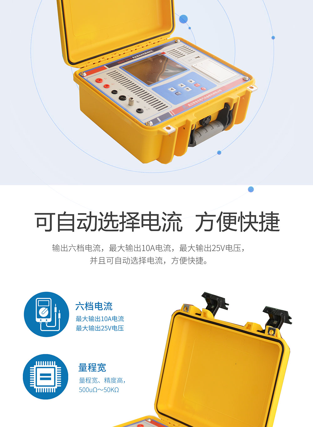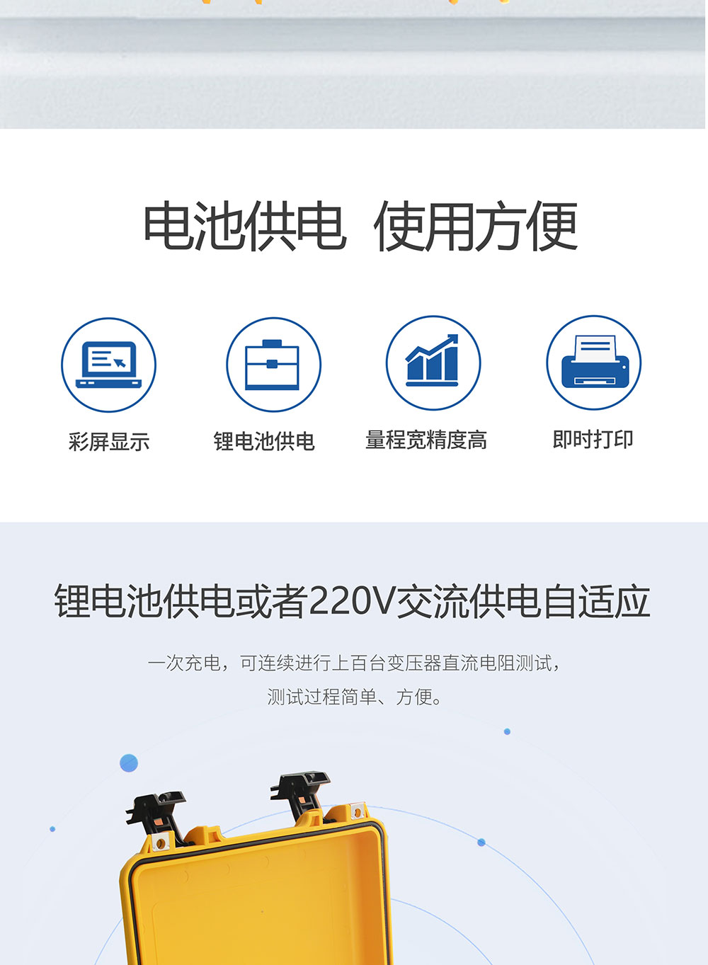 1、鋰電池供電或者220V交流供電自適應(yīng),一次充電,可連續(xù)進(jìn)行上百臺(tái)變壓器直流電阻測(cè)試,測(cè)試過程簡(jiǎn)單、方便。