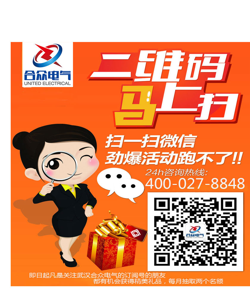 為了讓每位關注合眾電氣的朋友能在第一時間了解公司的動態,獲得線上支持,同時也是為了更好的服務于廣大新老客戶。因此決定推出:掃微信二維碼,贏精美禮品的活動。即日起凡是關注合眾電氣訂閱號的朋友都有機會獲得我們精心準備的精美禮品,每月抽取兩個中獎名額!我們會在每個月的12號公布獲獎名單,歡迎大家踴躍參與!