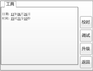 智能互感器測試儀系統工具界面,如圖10。在該界面中可以進行時間校對、系統升級等操作。其中:調試用于出廠調試,升級用于軟件界面的升級。