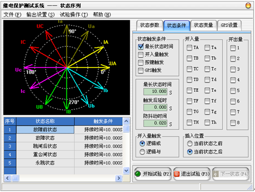 在微機(jī)繼電保護(hù)測(cè)試儀(鍵盤版)“狀態(tài)條件”屬性頁中設(shè)置當(dāng)前狀態(tài)的觸發(fā)條件。最長(zhǎng)狀態(tài)時(shí)間和開入量觸發(fā)可同時(shí)選擇作為一種觸發(fā)條件。兩者為“或”的關(guān)系,只要其中一個(gè)條件滿足,試驗(yàn)將進(jìn)入到下一狀態(tài)。在故障前狀態(tài)最長(zhǎng)狀態(tài)時(shí)間的設(shè)定時(shí),一般要大于保護(hù)裝置的整組復(fù)歸或重合閘的充電時(shí)間。當(dāng)滿足所設(shè)置的觸發(fā)條件后,試驗(yàn)自動(dòng)進(jìn)入到下一狀態(tài)。觸發(fā)條件滿足后,測(cè)試儀的對(duì)該狀態(tài)的輸出要在觸發(fā)后延時(shí)結(jié)束后(設(shè)置了觸發(fā)后延時(shí)時(shí)間),方進(jìn)入到下一試驗(yàn)狀態(tài)。在“狀態(tài)條件”屬性頁中還可以設(shè)置開入量、開出量和狀態(tài)插入的位置。