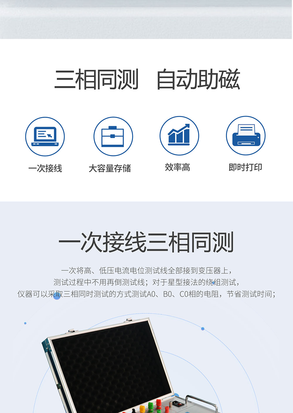 2、對(duì)于星型接法的繞組測(cè)試,儀器可以采取三相同時(shí)測(cè)試的方式測(cè)試A0、B0、C0相的電阻,節(jié)省測(cè)試時(shí)間;