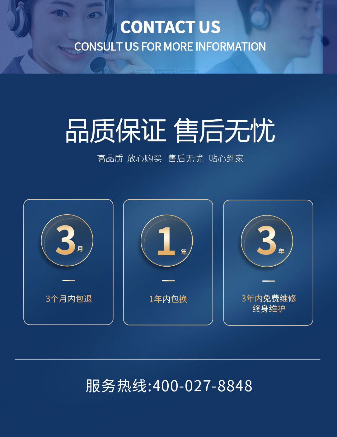 我們的售后服務(wù)承諾是:“3個(gè)月內(nèi)包退,1年內(nèi)包換、3年免費(fèi)維修,終身維護(hù)”。在未來的日子里,我們將一如既往的堅(jiān)持三類星級(jí)服務(wù)!
