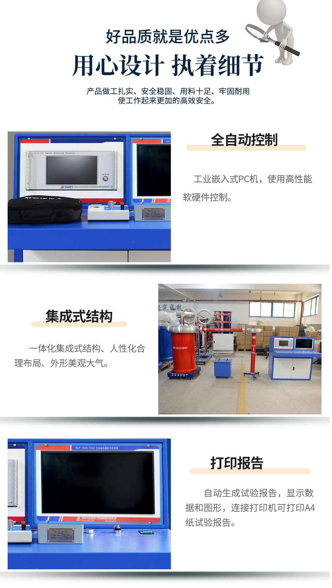 該試驗裝置適用于供配電系統(tǒng),電力變壓器制造廠、工礦企業(yè)、科研部門等,對各種高壓電氣設(shè)備、電器元件、絕緣材料進(jìn)行工頻或直流高壓下的絕緣強(qiáng)度試驗,是高壓試驗中不可少的重要設(shè)備。巧妙的將無局放試驗裝置(變壓器控制部分)和局部放電檢測儀結(jié)為一體,外觀亮麗輕巧,使測試過程更加方便簡單。